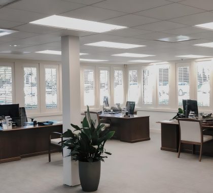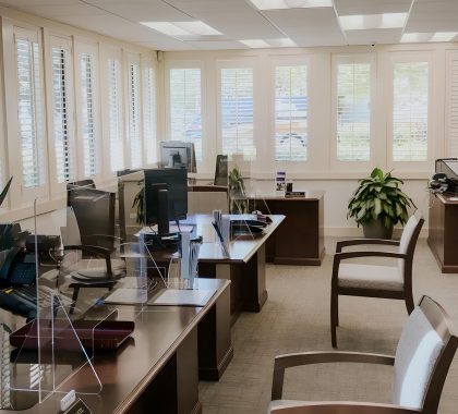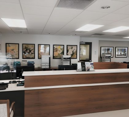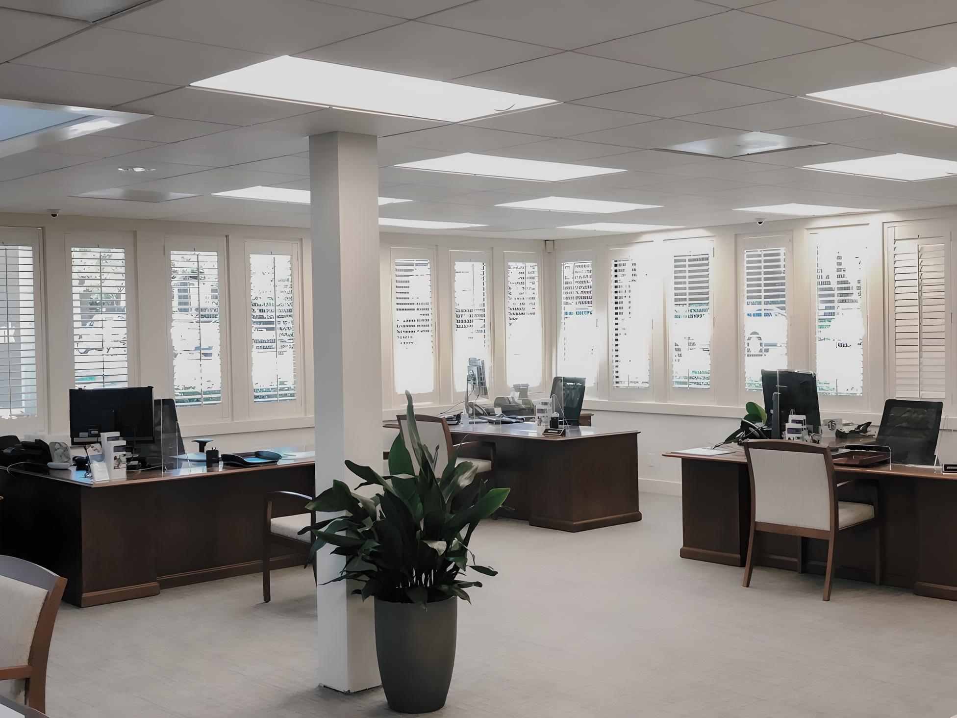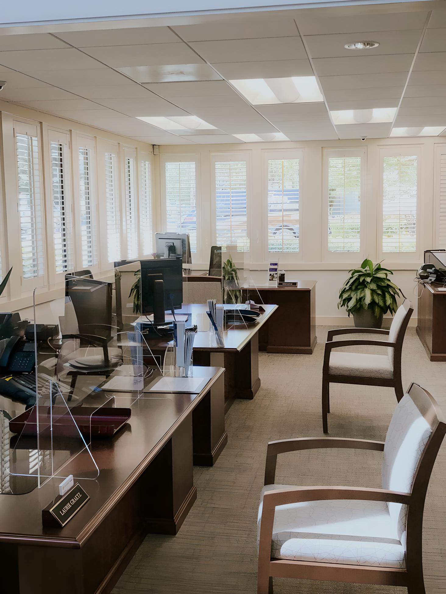 even though there was an aspiration to embrace the evolving landscape of banking, the relocated branch hesitated to fully undergo a daring overhaul. as a result, we guided the client through gradual adjustments, taking small strides toward the future by delicately reimagining the application of their conventional design elements within the space and giving the exterior a much-needed updated paint job. by incorporating a modern concierge-style teller line and integrating their distinctive stone as a contemporary accent inlay, this new location pays homage to both the historical roots and the upcoming direction of its banking identity.